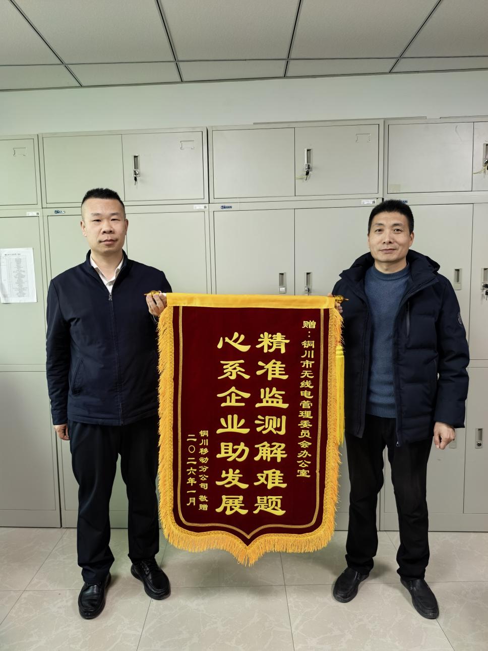 “非常感谢你们的高效处置,不仅帮我们挽回了损失,更保障了广大用户的通信权益。”2026年1月22日,中国移动铜川分公司一行人来到铜川市无线电监测站,将一面印有“精准监测解难题 心系企业助发展”的锦旗送到工作人员手中,专程感谢监测站在查处运营商基站干扰案件中的责任与担当。