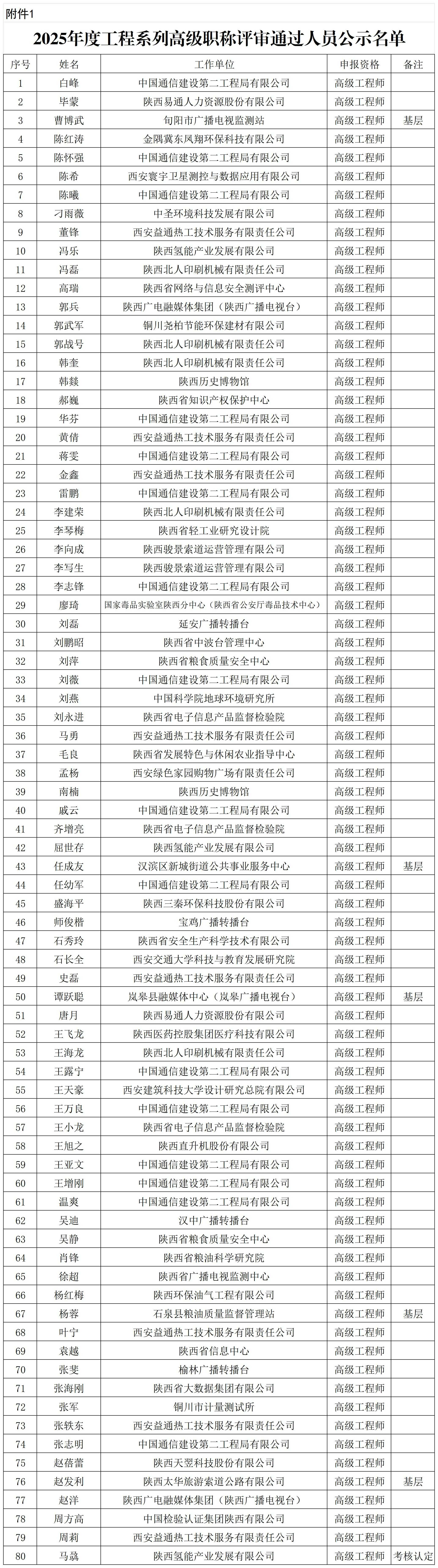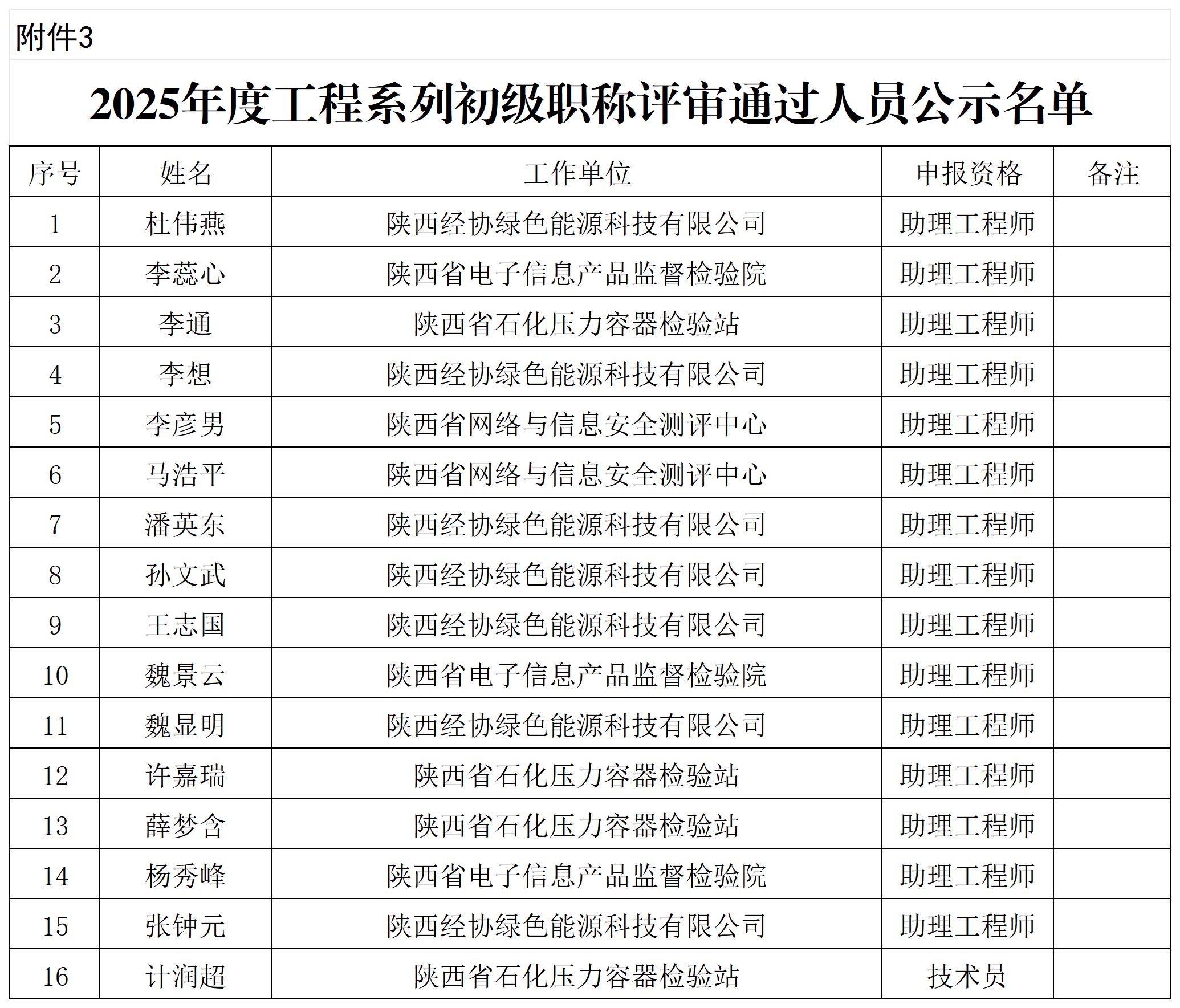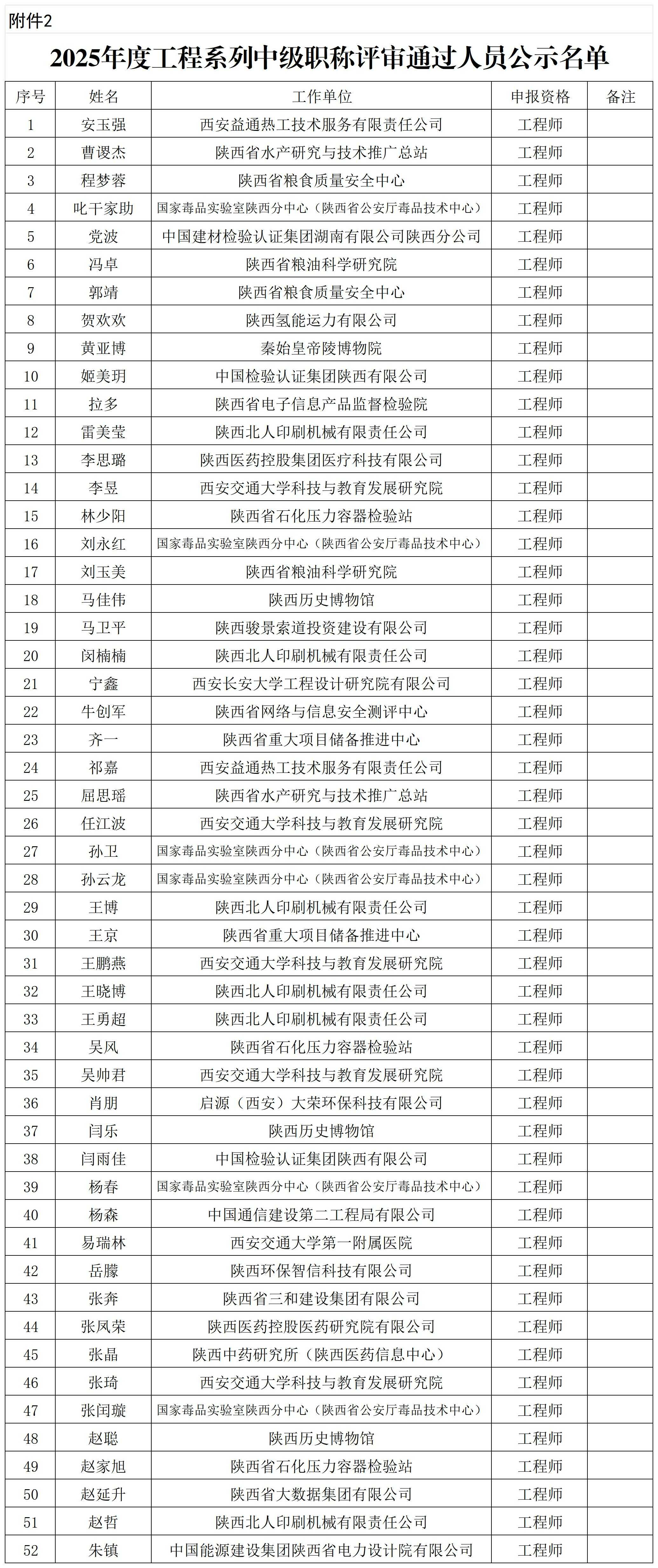 按照《陕西省职称评审管理规定》,经省工业和信息化厅2025年度工程系列、工艺美术系列职称评审委员会评审,现对通过人员予以公示。如对公示人员有异议,请于公示结束日之前(信函以到达日邮戳为准)实名书面反映意见。