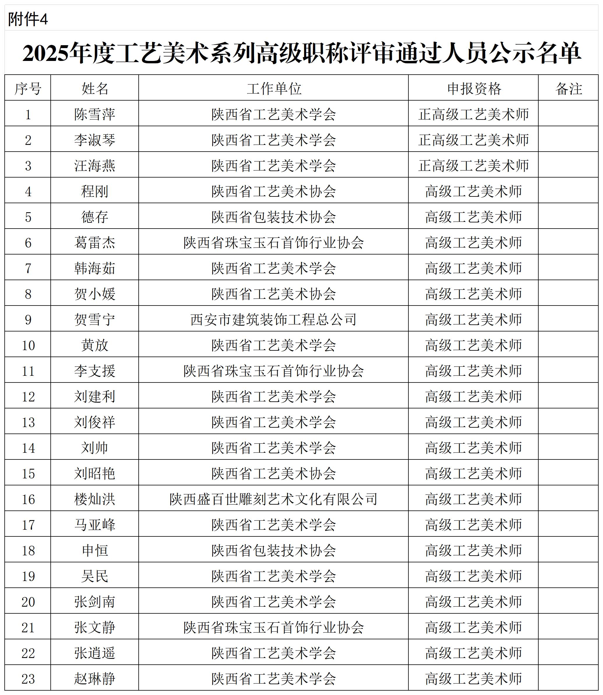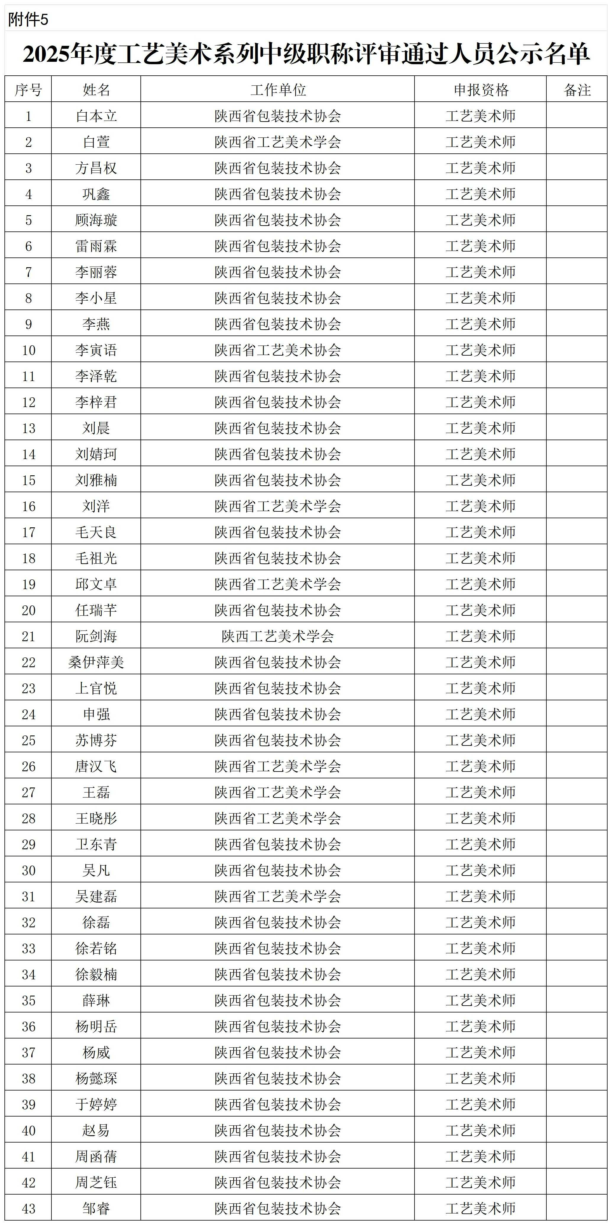 陕西省工业和信息化厅2025年度工程系列 工艺美术系列职称评审通过人员公示