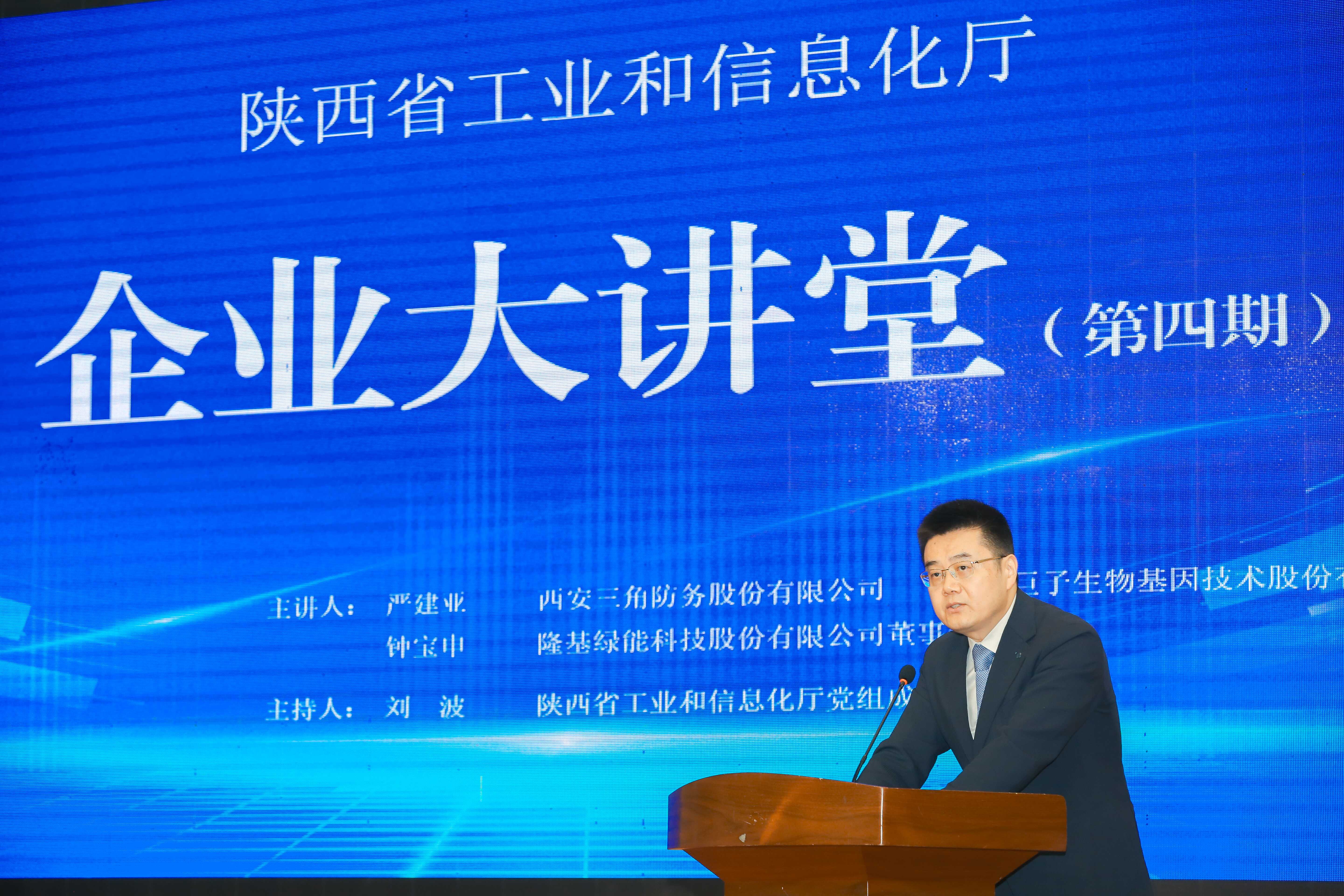 为深入贯彻落实民营企业座谈会精神,助力企业高质量发展。5月27日下午,由省工业和信息化厅主办的第四期“企业大讲堂”圆满举办,本期特邀西安三角防务、西安巨子生物基因技术股份有限公司董事长严建亚和隆基绿能科技股份有限公司董事长钟宝申分享企业发展经验。我省民营企业负责人代表、省工信厅干部代表共计300余人现场参加,2500余名企业家通过“陕企通”视频号线上观看直播,线上观看人数突破新高。省工信厅党组成员、副厅长刘波主持并讲话。